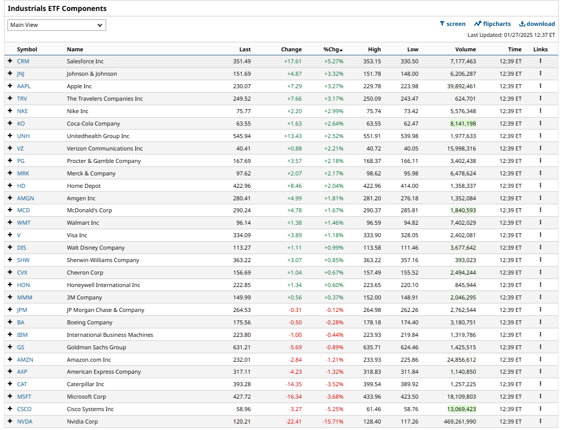 DIA 0.00%↑ is a notable outperformer. A look at the components as of 12:40 -