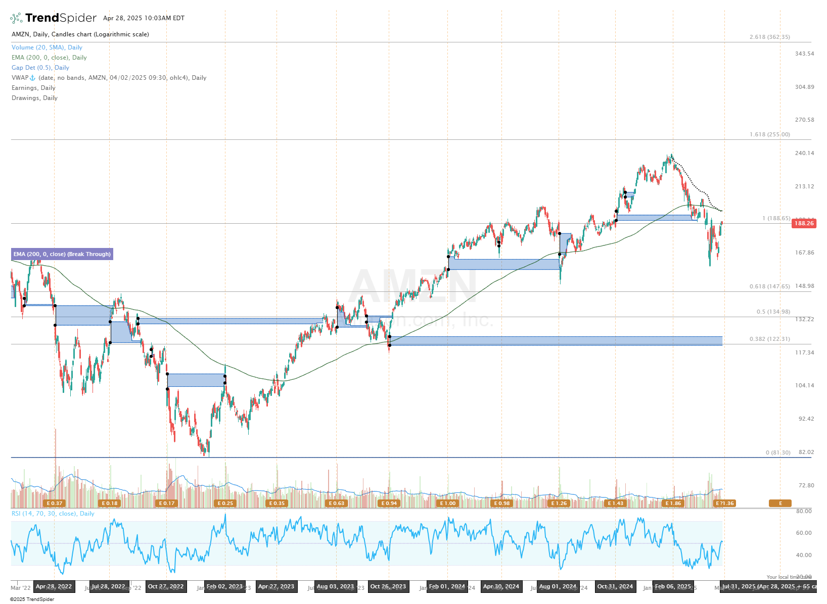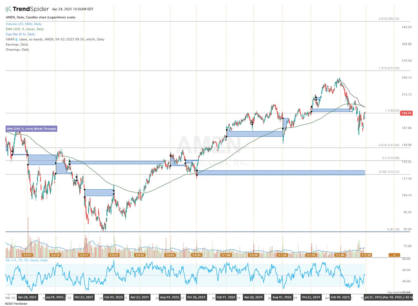 AMZN 0.00%↑ reports after market close Thursday. I’m watching the confluence of the AVWAP from the February high, with the 200 day moving average. A break above that level would open this one up for some long trade ideas, and more broadly, could be a positive harbinger for the markets as a whole.
