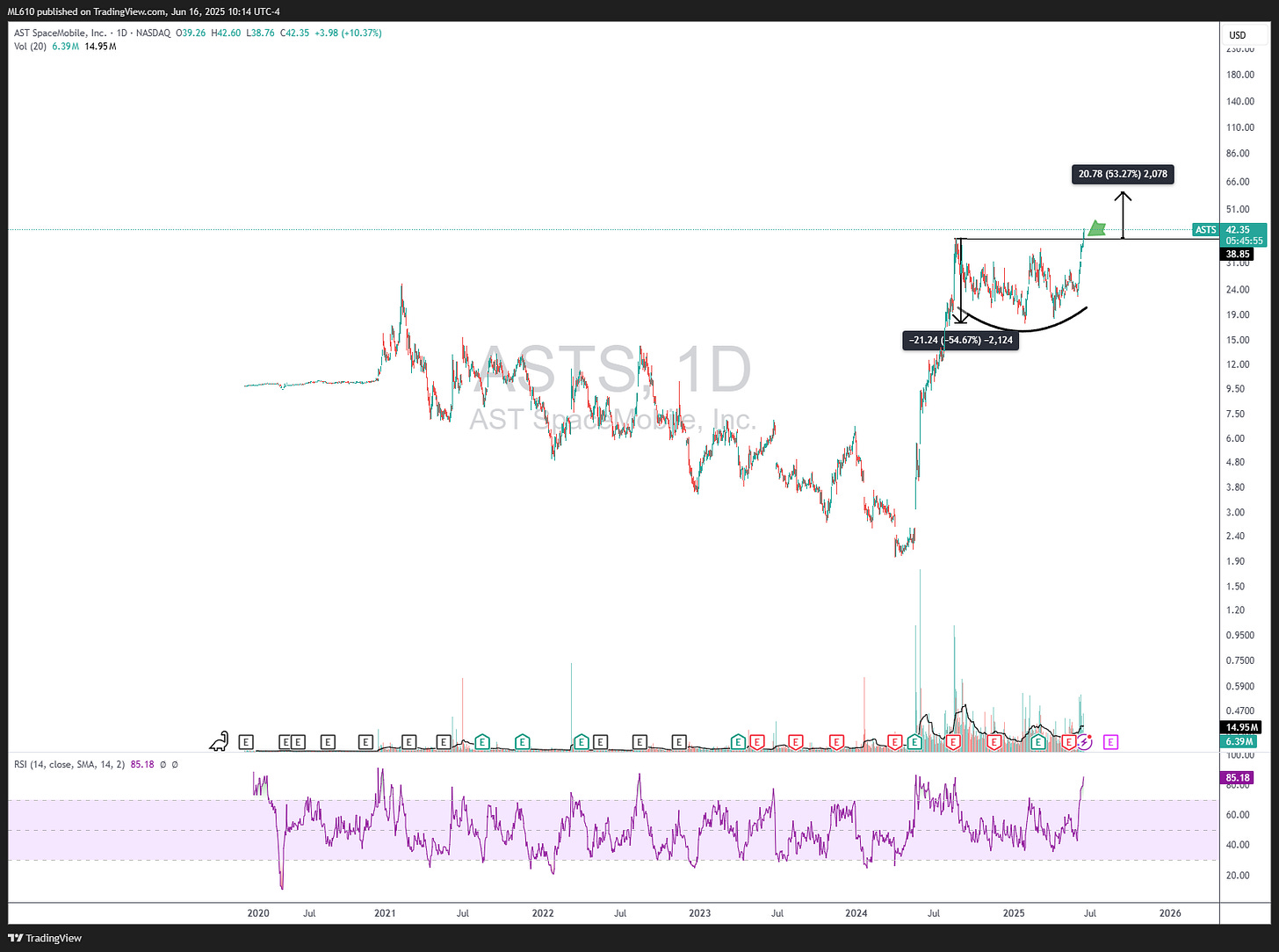 ASTS 0.00%↑ breaking out of a base this morning. This one’s purely a trading stock for me. Risk/Reward above the breakout line makes this a favorable take for me right here.
