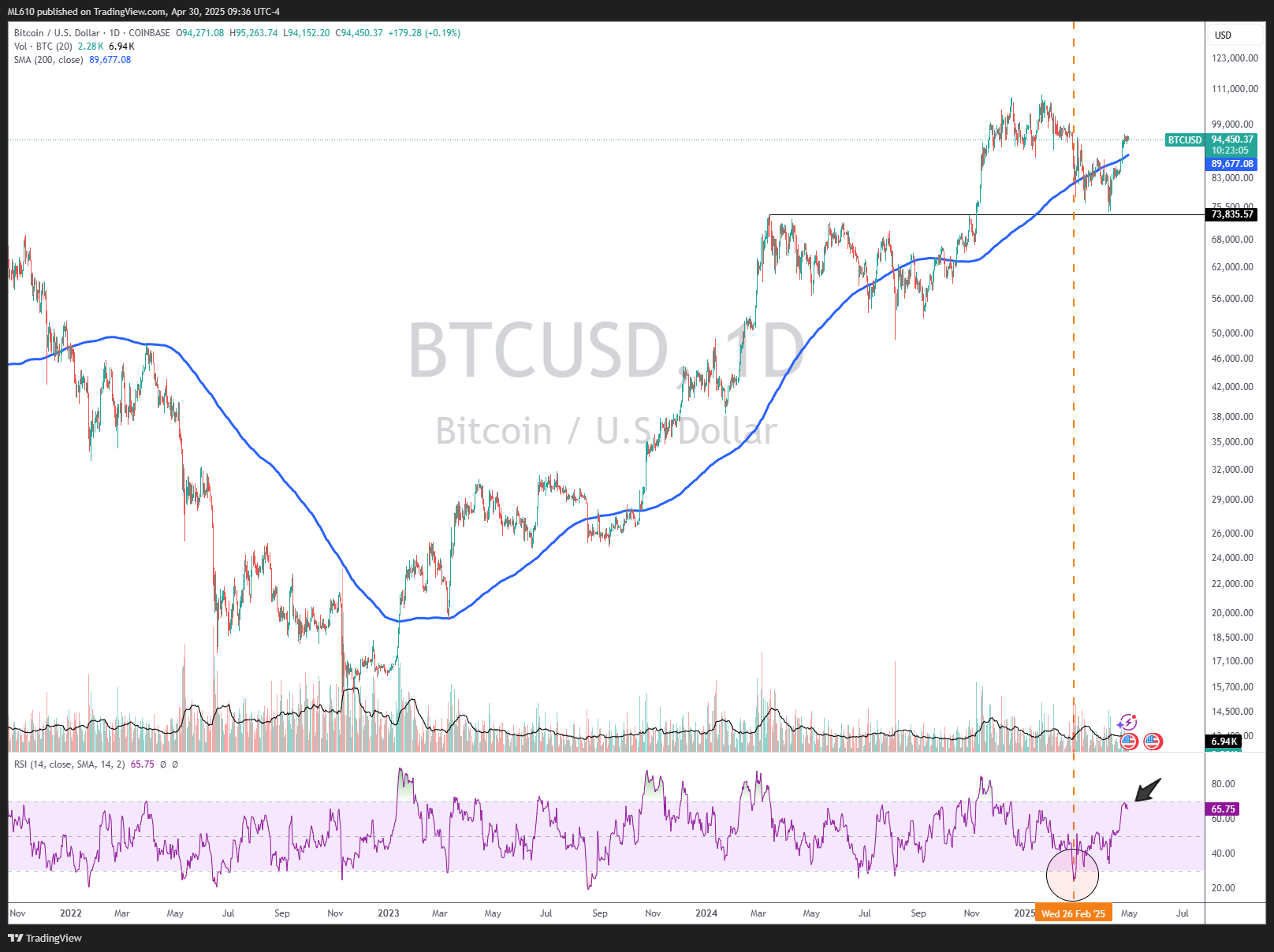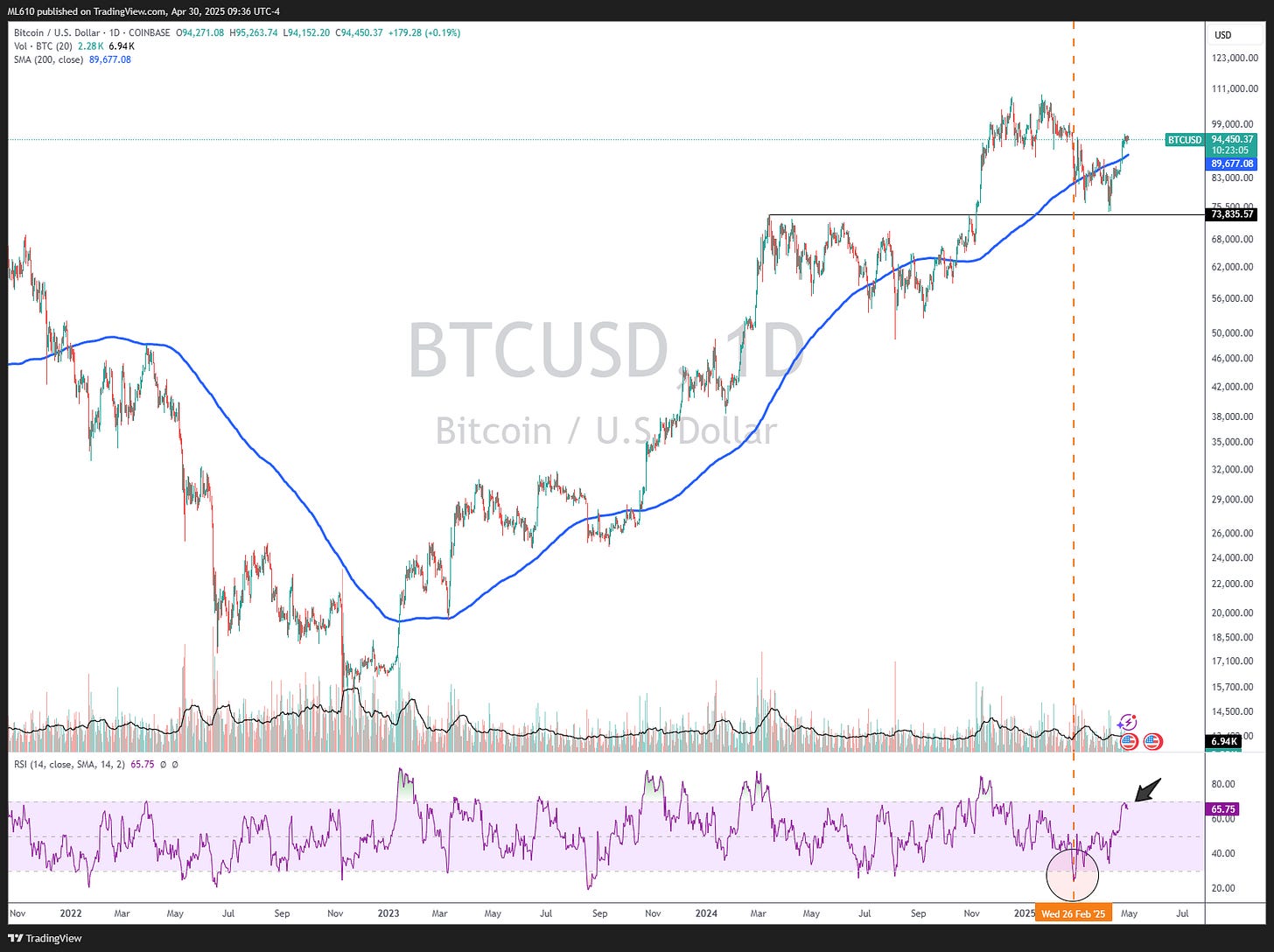 Price action looks to be favoring at least a short term pause for $BTC here in my opinion. We can see the February sell-off saw RSI reach “oversold” conditions and price briefly moving below the 200 day moving average. The move up of late looks to be stalling out, with RSI never quite breaching “overbought” levels (arrow).