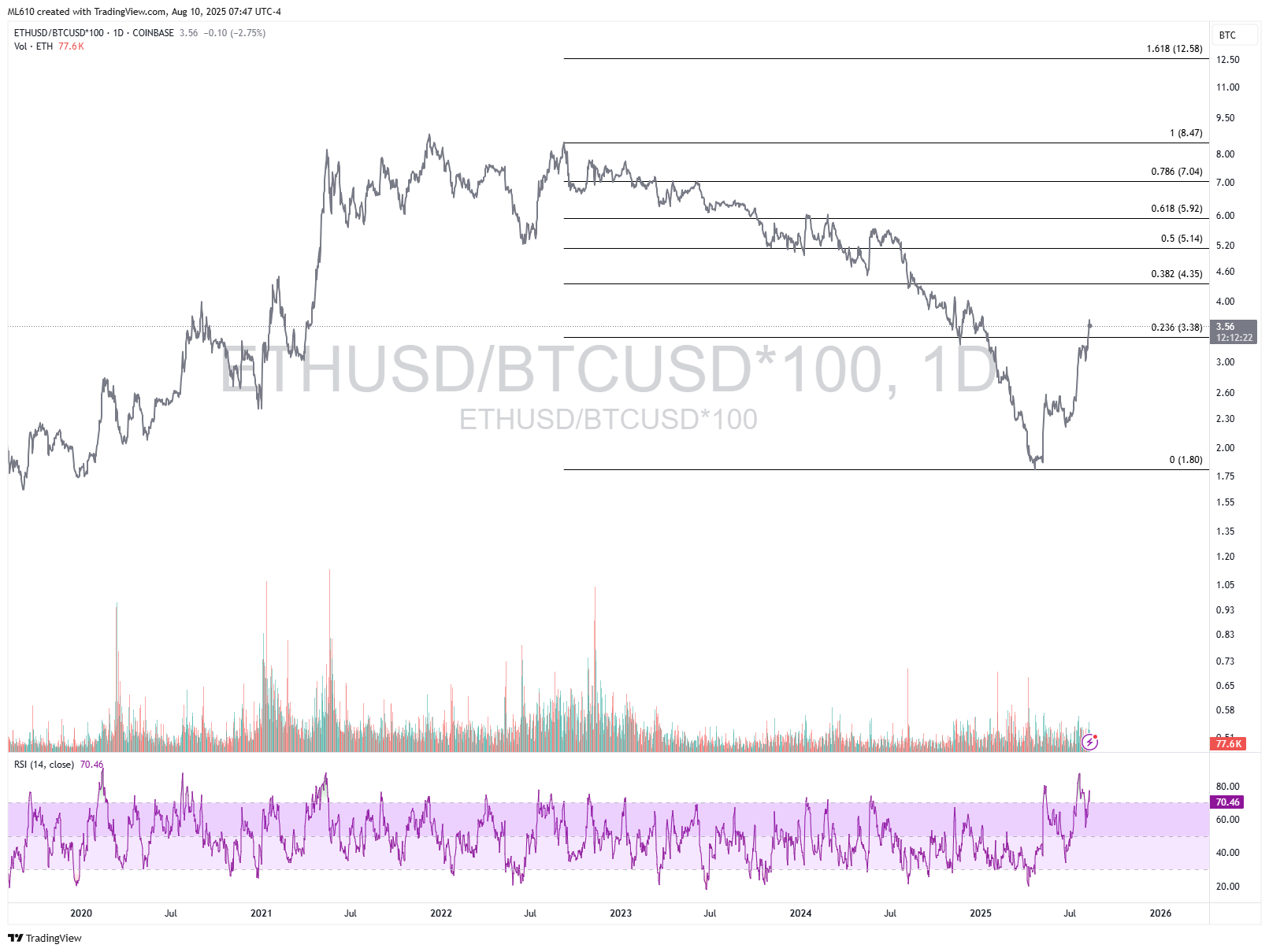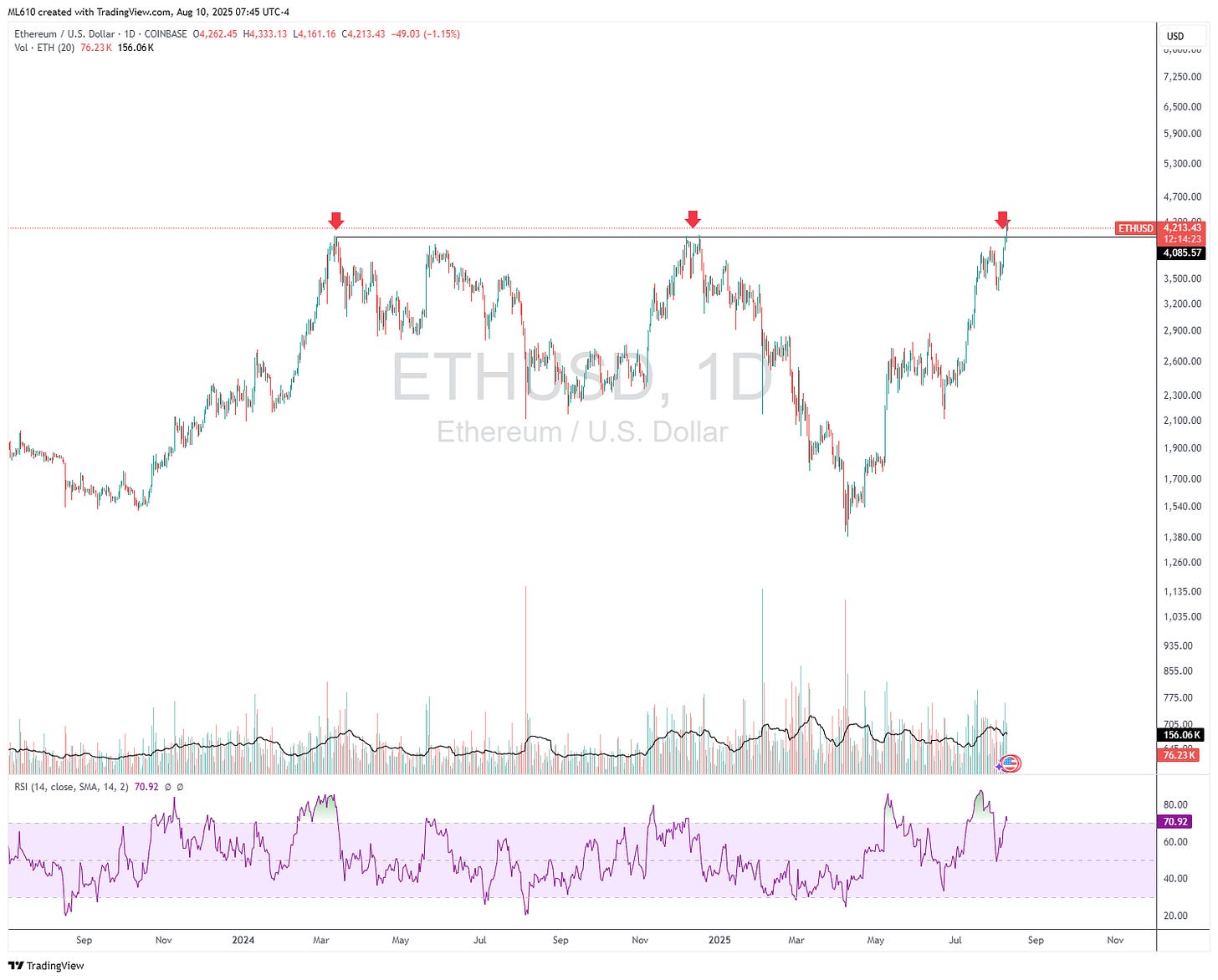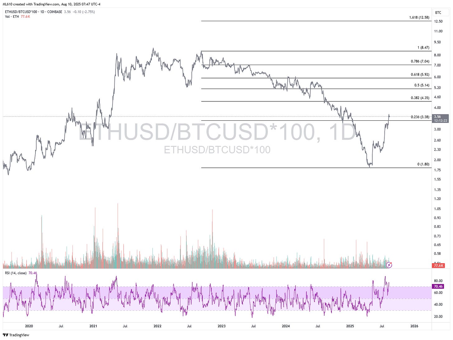 Ethereum Breaks Out$ETHMichaelAug 10, 20251ShareQuestion now becomes how much room this has to run, specifically relative to $BTC. Looks like quite a bit. I’m at a full position in $ETH above the $4K breakout level.