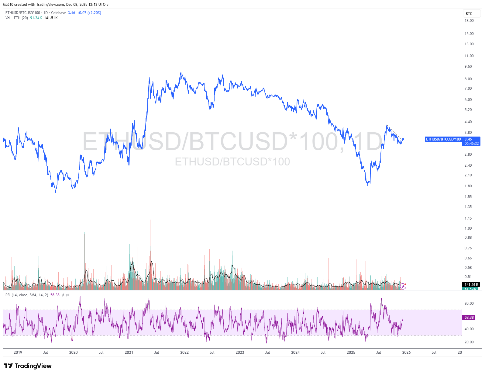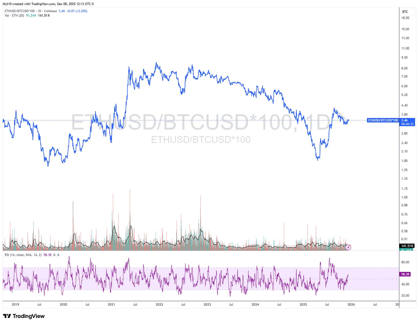 Ethereum's Relative Strength$ETH $BTCMichaelDec 08, 20251ShareMy incremental capital allocations into crypto and falling into $ETH. Relative strength continues to dictate that.