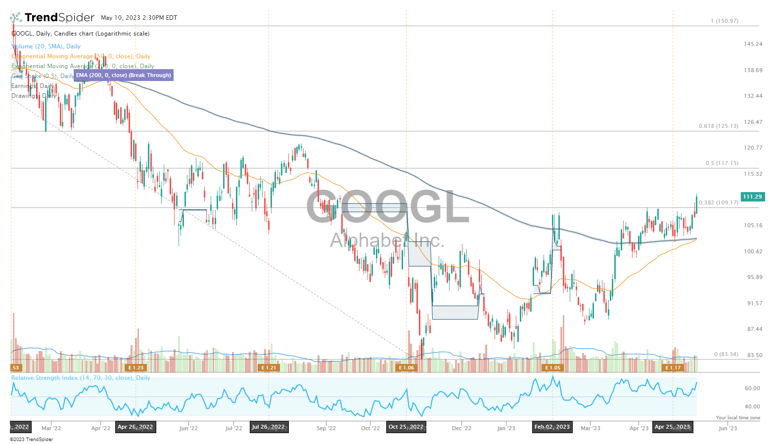 GOOGL 0.00%↑ putting in a beautiful candle today, and golden cross setup (50 day crossing 200 day). $117 would be the 50% mark from the stocks all time high to recent low.