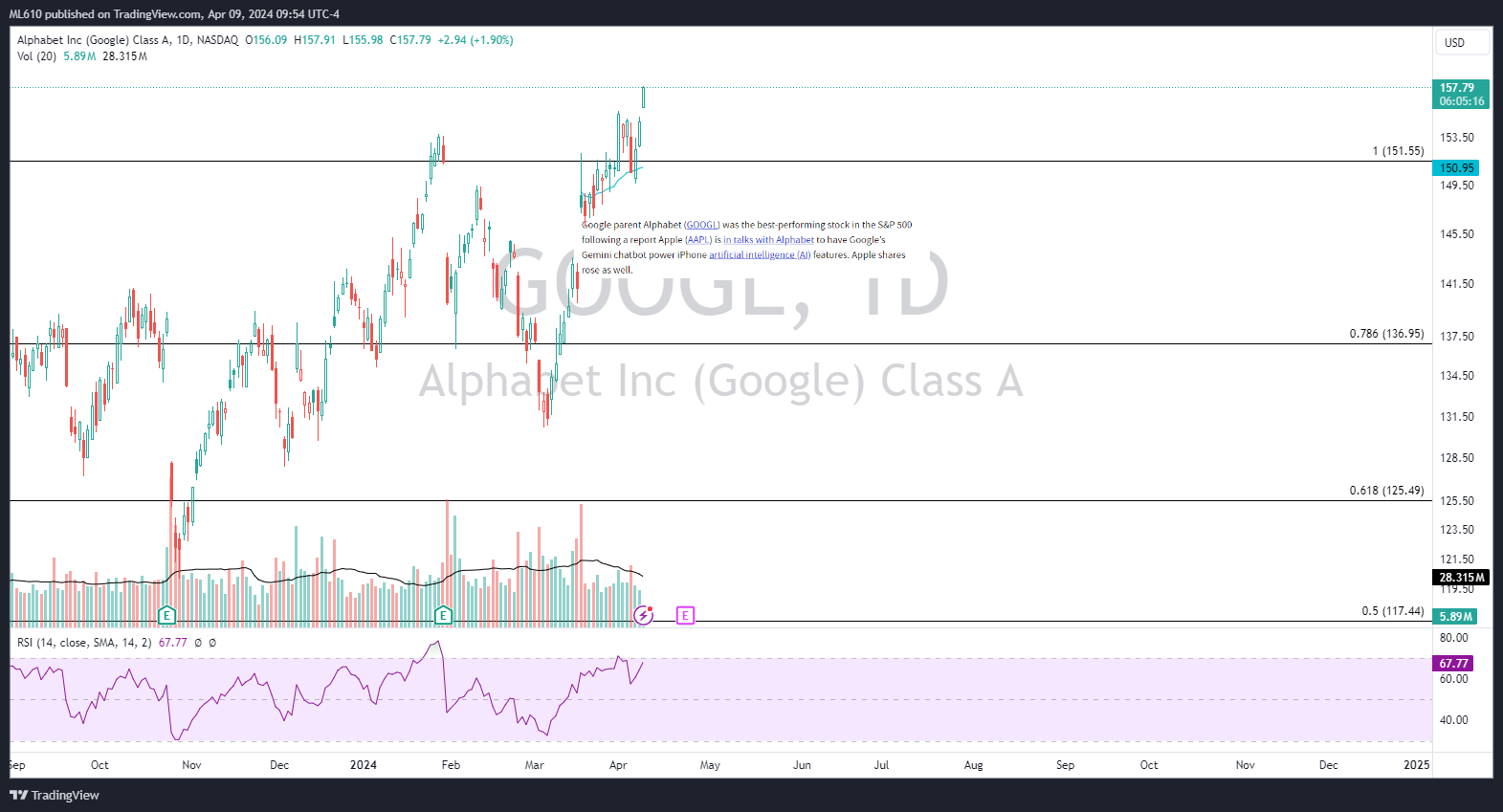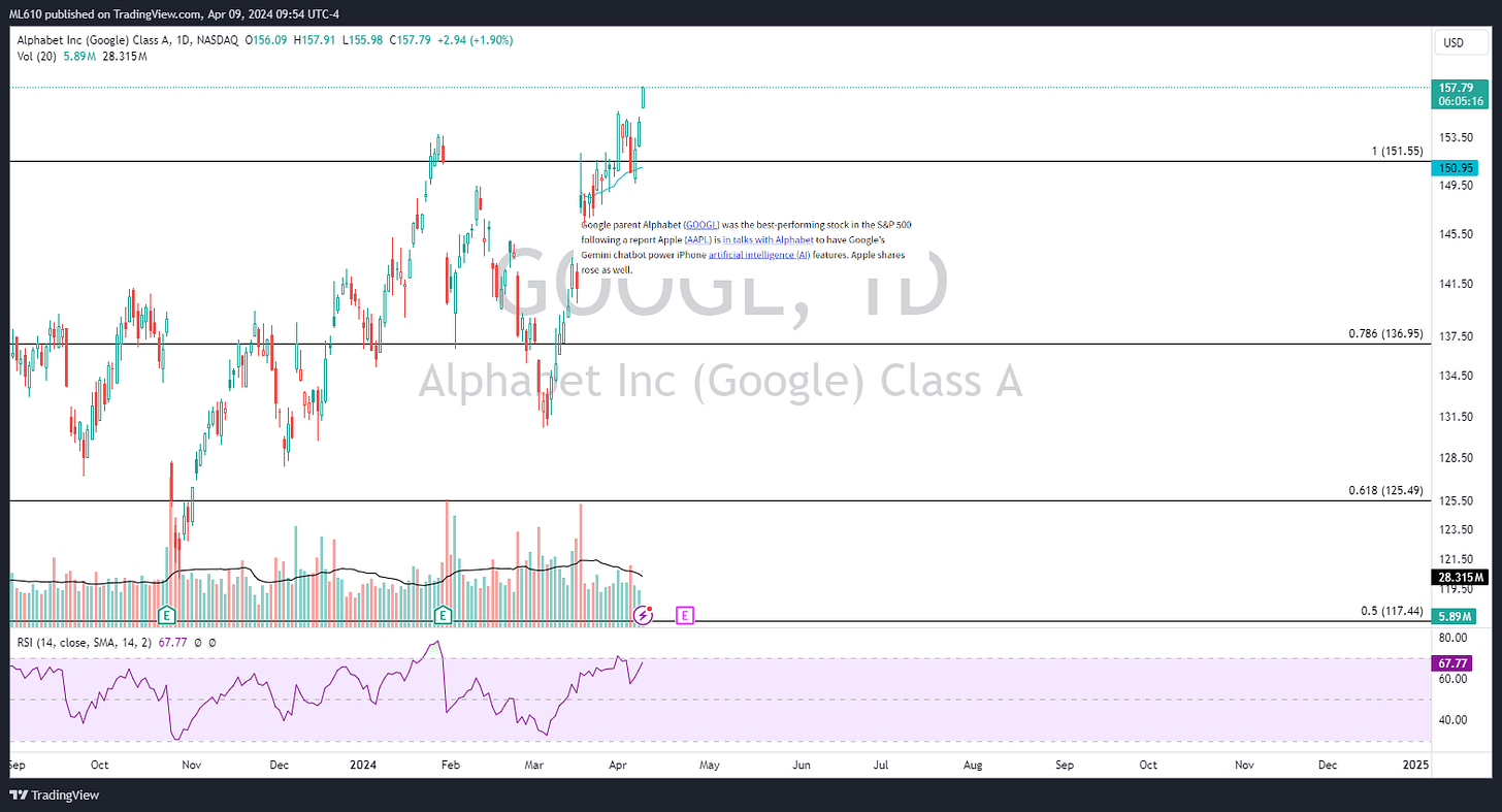 GOOGL 0.00%↑ has remained strong since the March 18th gap up following the AAPL 0.00%↑ news. They report on 4/23, and while $150 could be a battleground in the near term, my bias is long until the facts change.