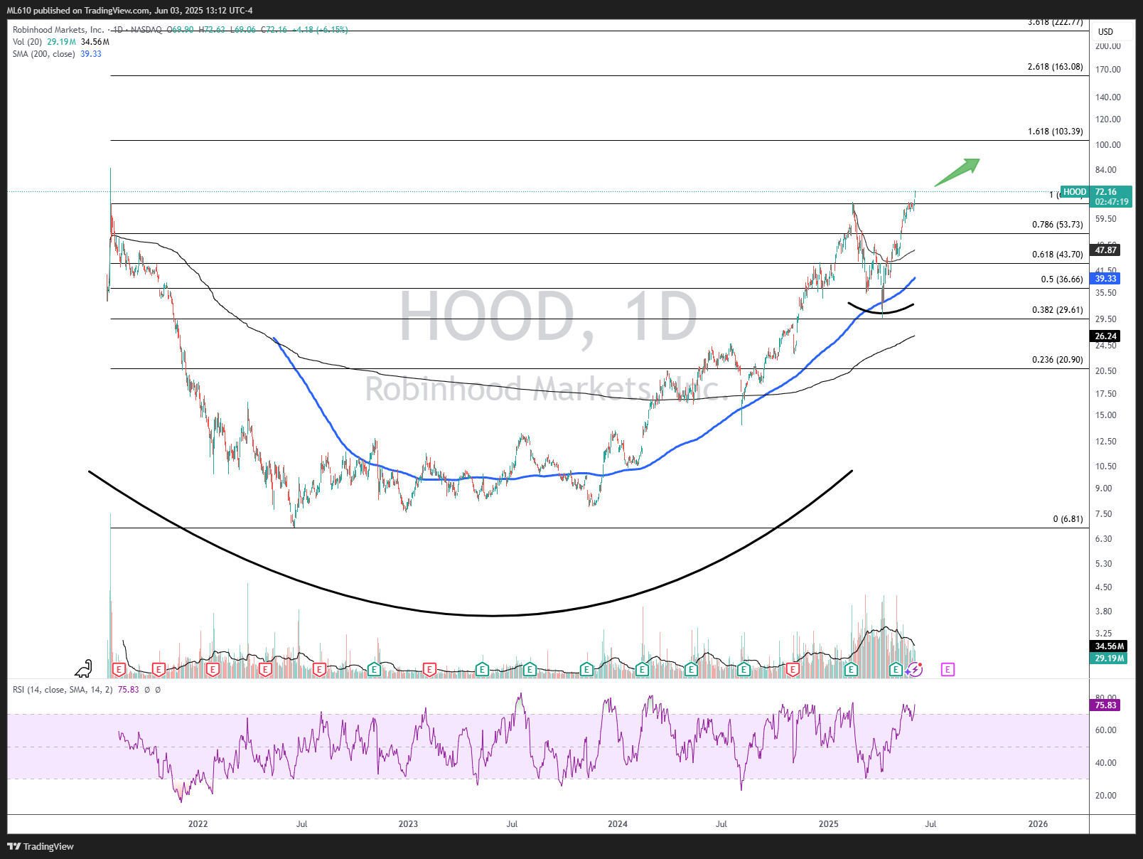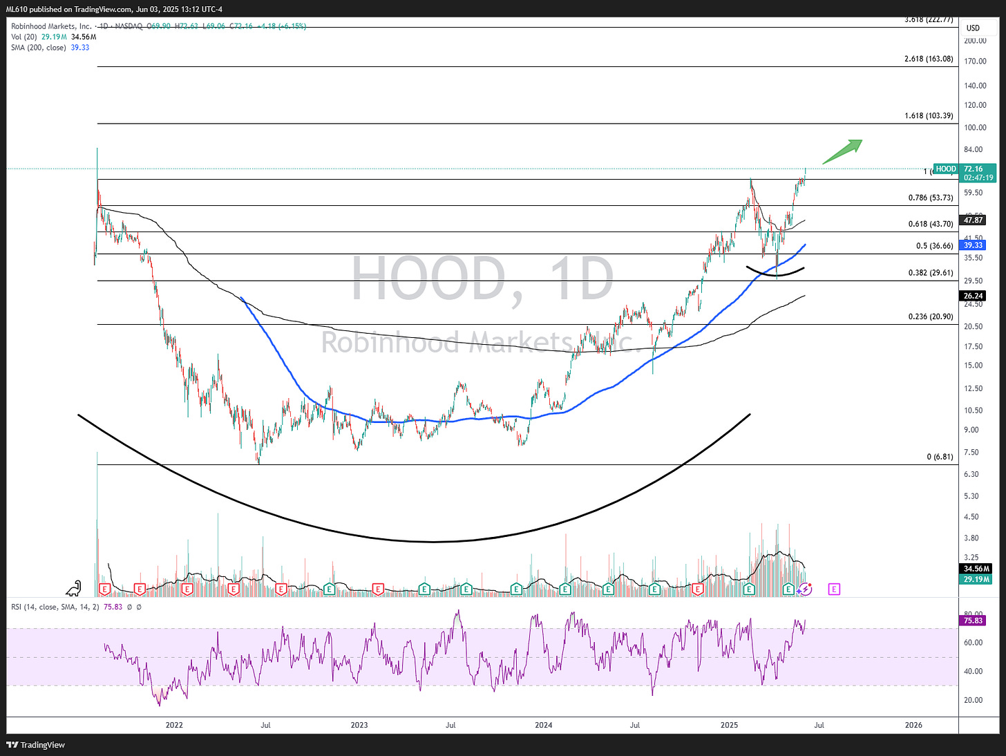 HOOD 0.00%↑ is a name I’ve been posting about since I started. A base breakout, organized pullback, now ripping to new highs. This one looks primed for $100 at some point.