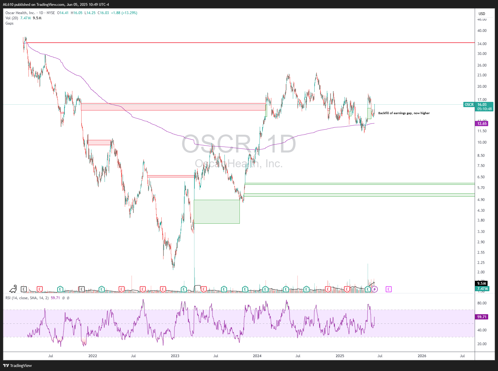 Another one from my recent IPO list, OSCR 0.00%↑ popped on earnings at the beginning of May, spent the rest of the month consolidating the gap, and is now powering through rising 5 and 20 day moving averages back into the range. Purple line represents AVWAP from IPO, which I’m using to manage the position on the downside.