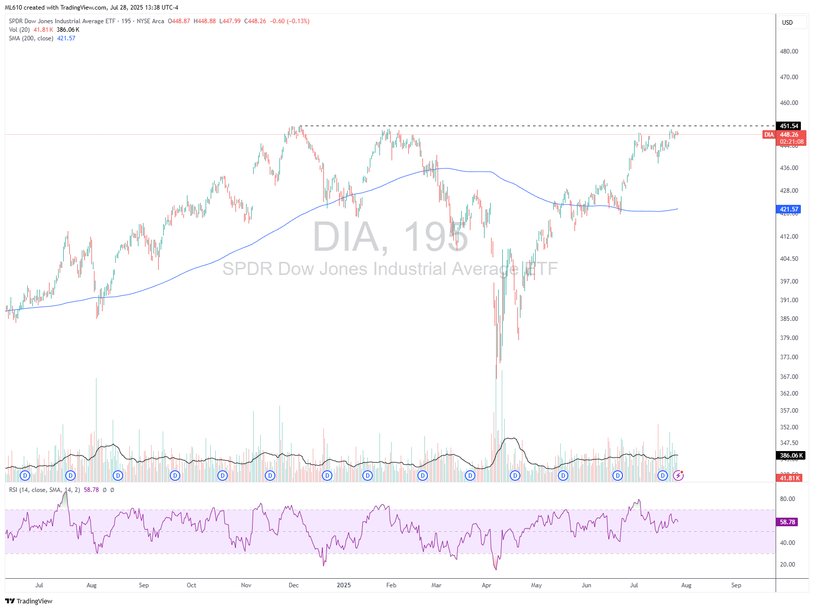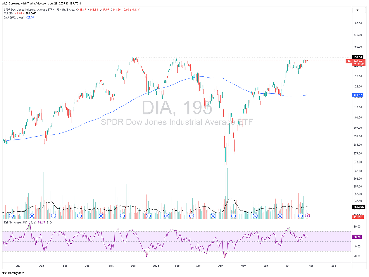 DIA 0.00%↑ is lagging SPY 0.00%↑ and QQQ 0.00%↑ in the bids for new highs, and with a heavy earnings week, I’m hedging some of the portfolio with some SDOW 0.00%↑ (3x inverse Dow 30). Index puts are also an option here with vol at such depressed levels. Short term moves which as I’ve talked about before, provide some insurance against liquidating out of positions I’m not yet ready to.