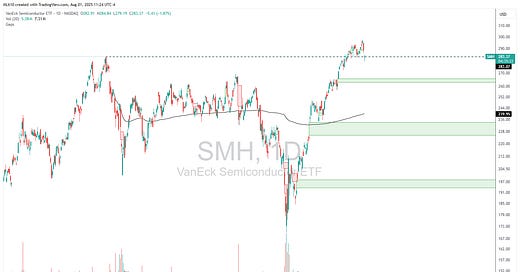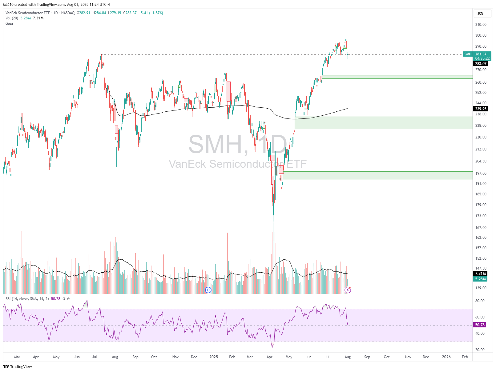 This two day sell-off in SMH 0.00%↑ has taken it back to the Jul ‘24 cycle high, and with unfilled gaps below, it seems pretty important for it to defend this level. Long above / short below is how I’m playing it from a trading standpoint.