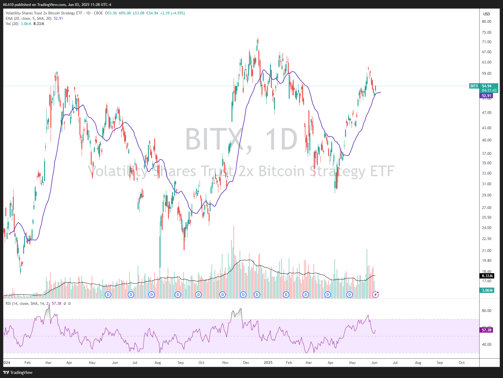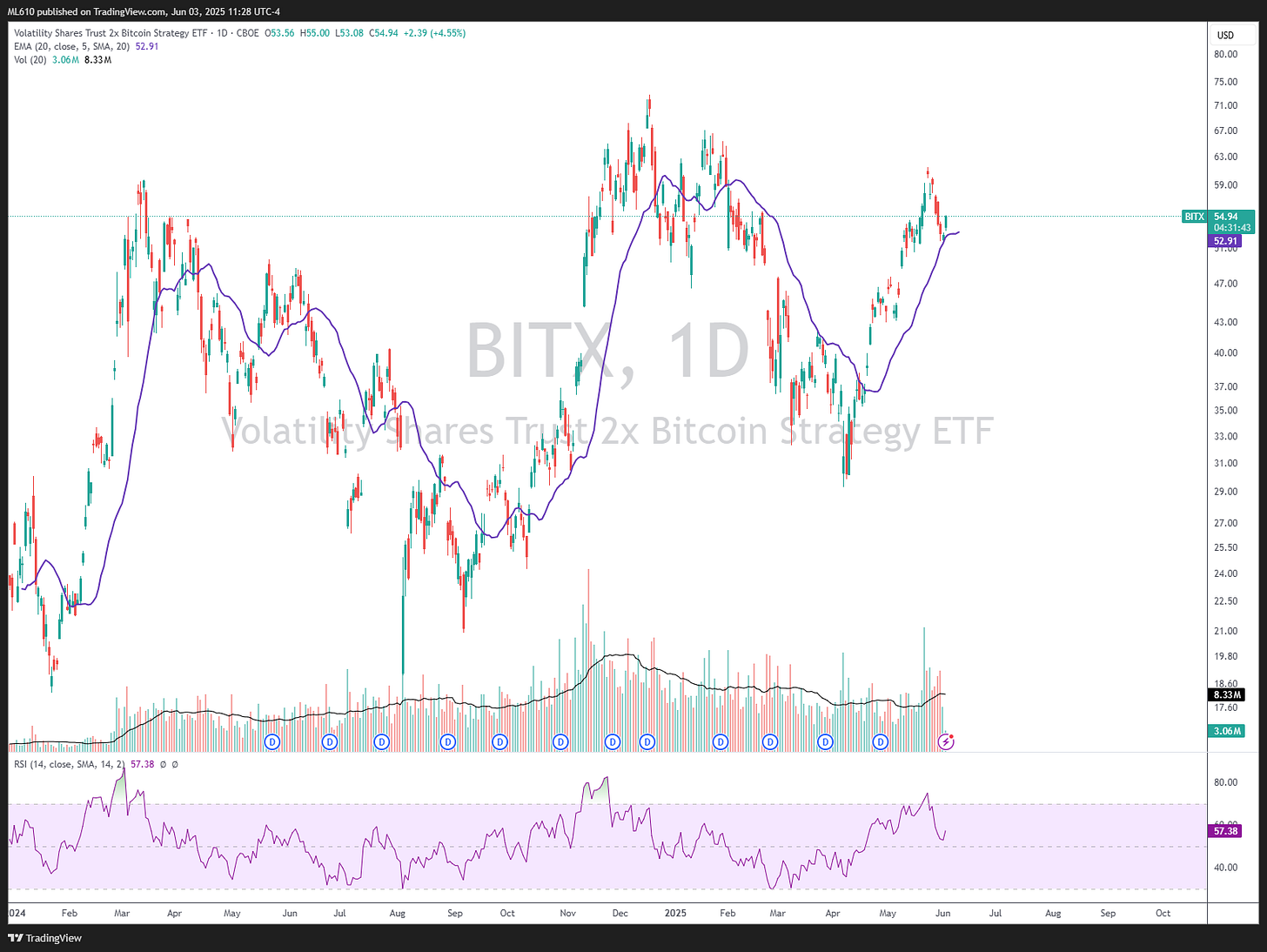 I’m trading this short term bounce via BITX 0.00%↑ , which is 2x, and can be risk managed against the 20 day pictured below.