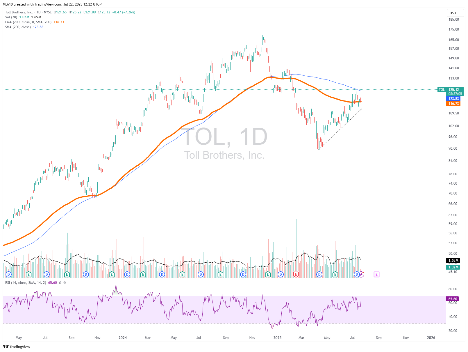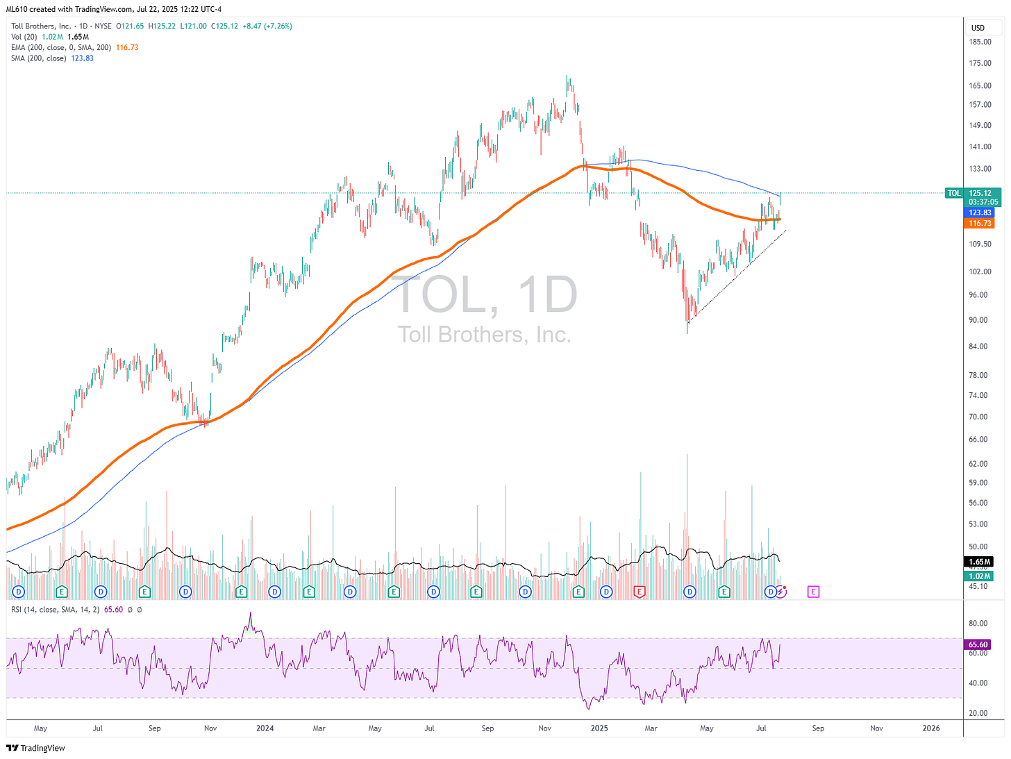Toll Brothers$TOLMichaelJul 22, 2025ShareFollow up from 7/10 post Mind Your Moving Averages - Homebuilders EditionMichael·July 10, 2025Read full storyTOL 0.00%↑ is setting up beautifully - Managing risk against the 200 day.