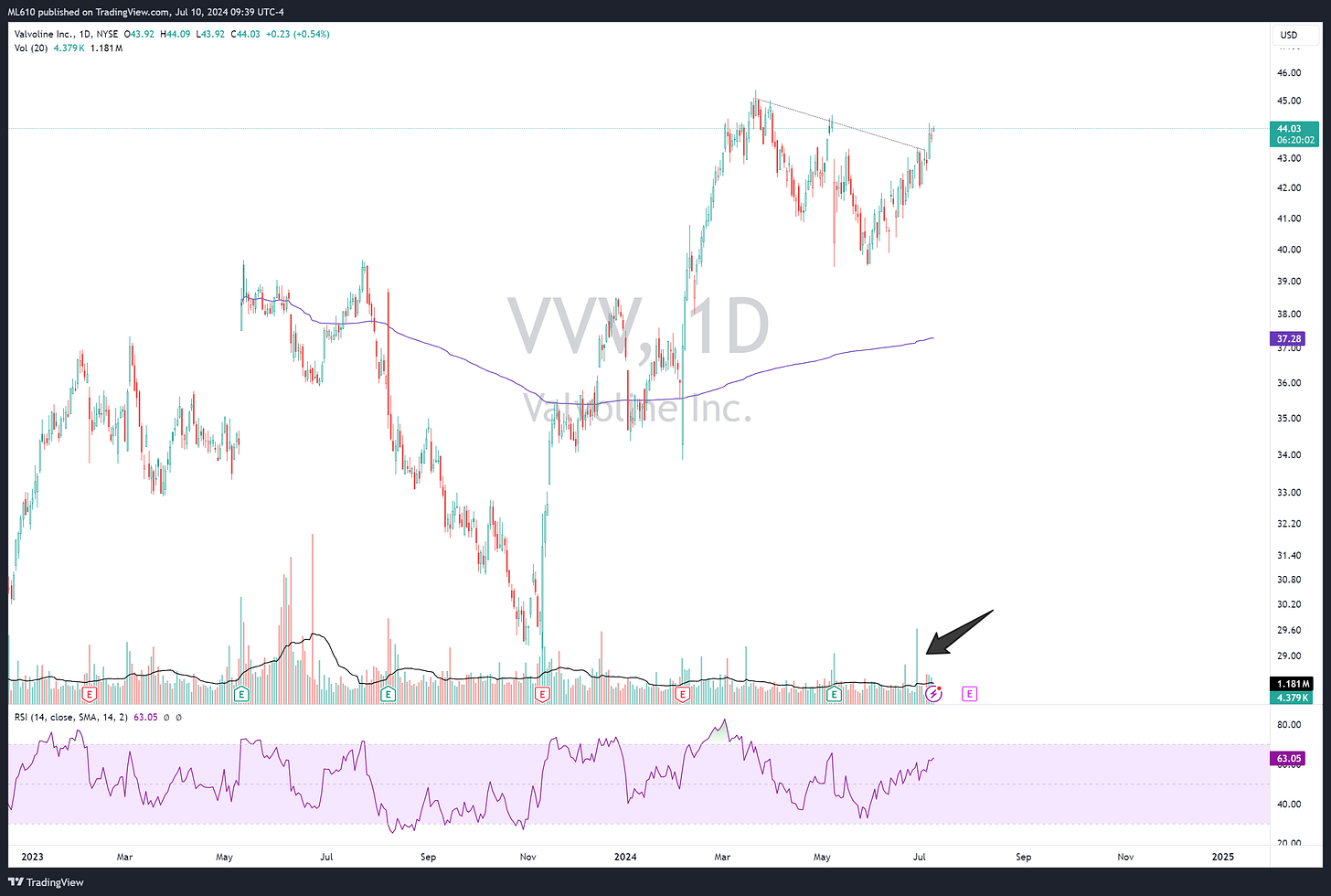 Valvoline$VVVMichaelJul 10, 2024ShareThis one’s been working. I grabbed a little on that diagonal break, liking the volume I saw occurring with it. Earnings 7/31, broad markets grinding to new highs, I’m looking for a move back towards former highs.